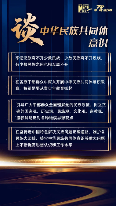 习近平强调,要在各族干部群众中深入开展中华民族共同体意识教育,特别是要从青少年教育抓起,引导广大干部群众全面理解党的民族政策,树立正确的国家观、历史观、民族观、文化观、宗教观,旗帜鲜明反对各种错误思想观点。