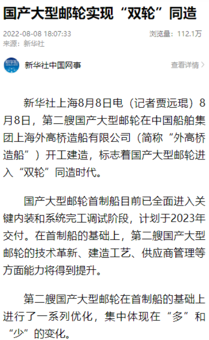 目前国产大型邮轮首制船正处于内装阶段,“差不多装修了一半”,第二艘国产大型邮轮详细设计已完成约40%。未来,国产大型邮轮有望实现批量化、系列化建造敬请期待。